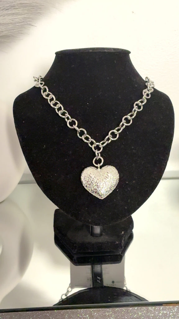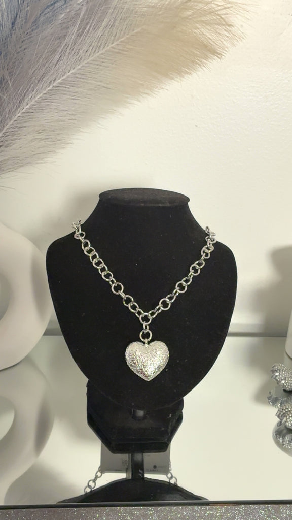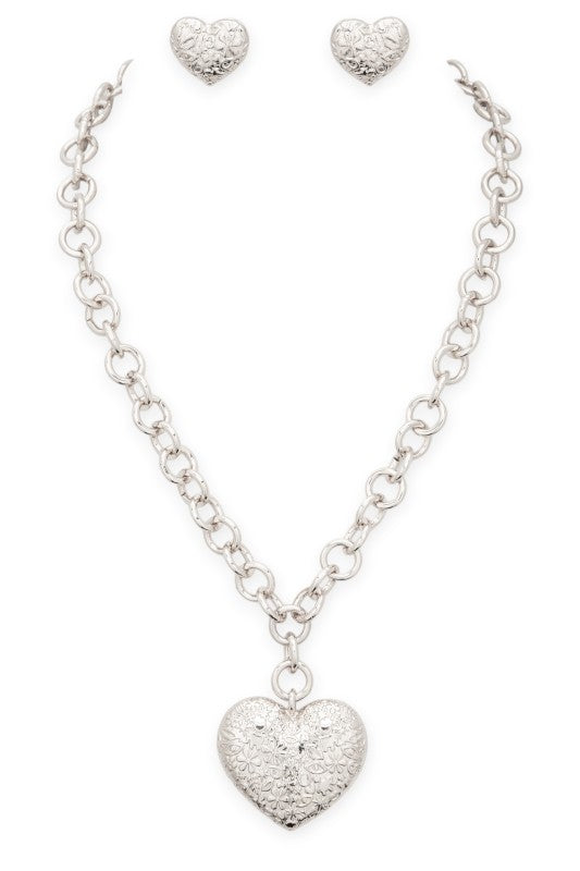 The Amour Luxe Set in Rhodium offers a modern take on statement jewelry. Featuring a bold chain necklace with a textured heart pendant and matching earrings, this set brings a cool-toned elegance that complements any look.