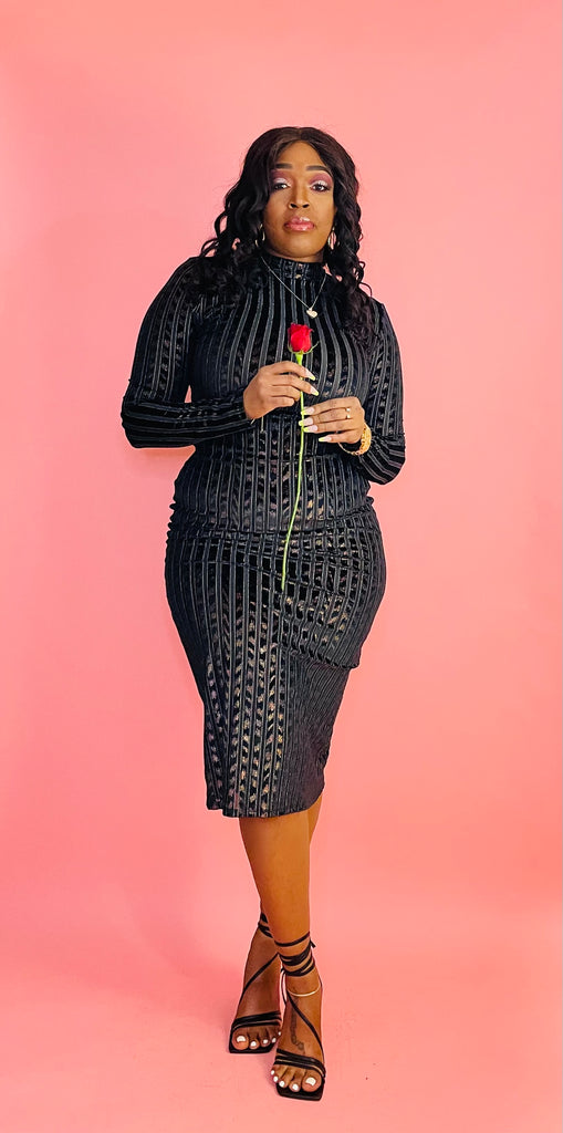 Attentions On Black Shimmer Metallic Long Sleeve Burn Out Midi Dress