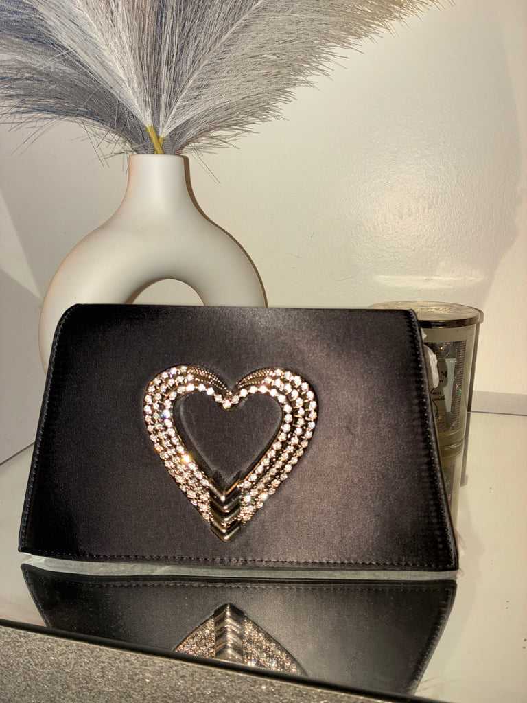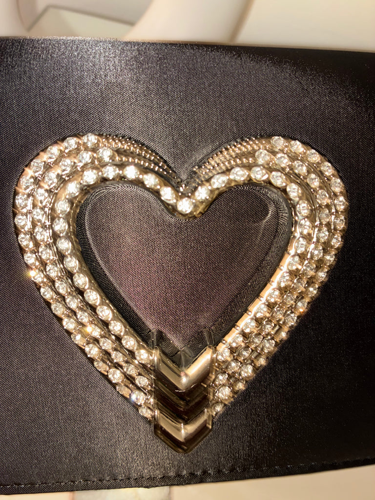 Upgrade your style with Part Of The Moment, the chic black satin rhinestone heart emblem clutch.